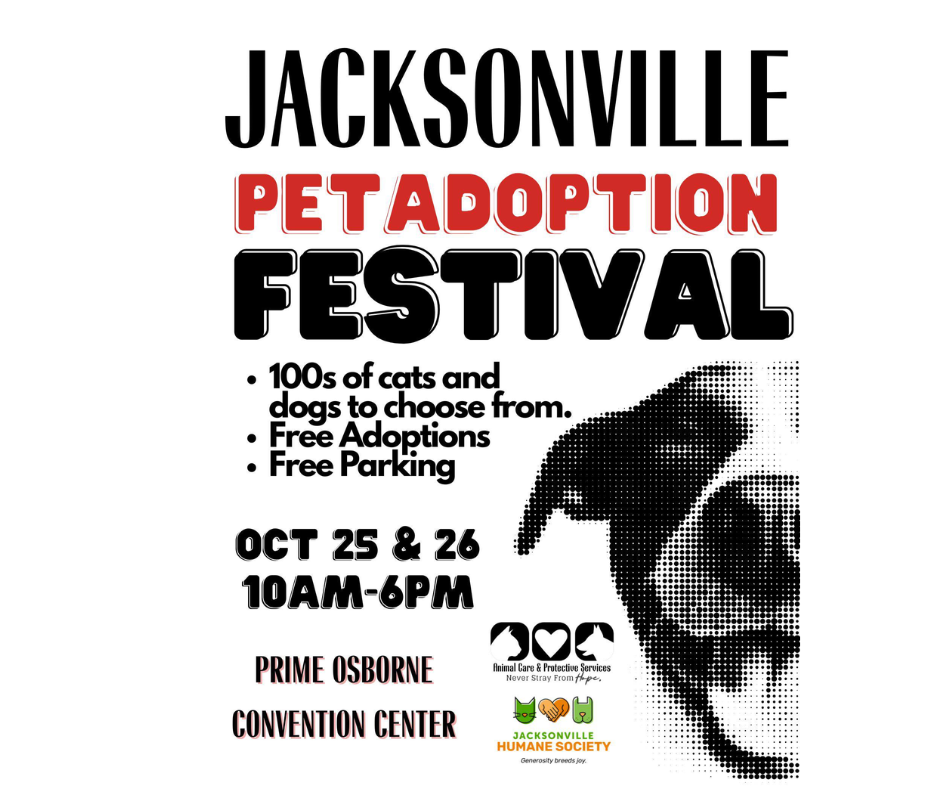 La Sociedad Protectora de Animales de Jacksonville y los Servicios de Cuidado y Protección Animal se reunirán bajo un mismo techo este fin de semana, junto al menos otros seis refugios locales en el Festival de Adopción de Mascotas de Jacksonville del 25 al 26 de octubre en el Centro de Convenciones Prime F. Osborn III.