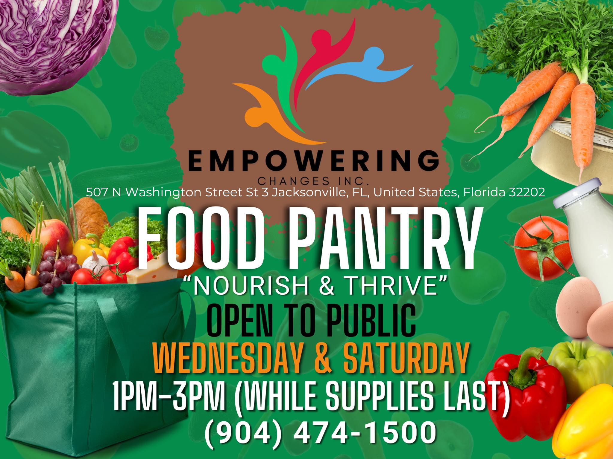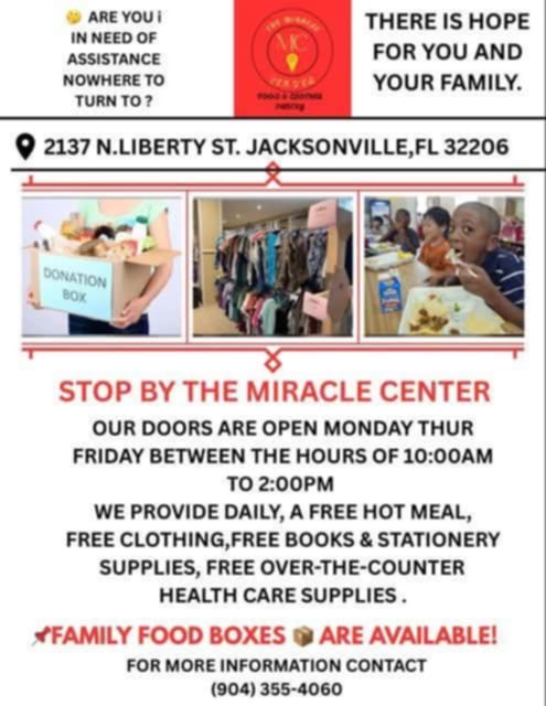 Los horarios de distribución de alimentos están sujetos a cambios durante las vacaciones. Verifique si hay cambios actualizados en las puertas de entrada del edificio o llame al (904) 448-4030 para obtener información actualizada.
